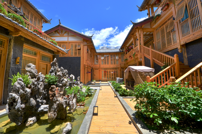 木府位于麗江古城南部,是歷代麗江木氏土司的府邸,建筑融合了明代中原建筑風(fēng)格和白族、納西族的工藝,精美壯觀,徐霞客曾贊“宮室之麗,擬于王者”。如今木府已是古城的一座地標(biāo),吸引無數(shù)游客來此欣賞。木府雖是土司王府,但宮室之瑰麗,不遜皇家,據(jù)說當(dāng)年既是“仿紫禁城而建”,鼎盛時(shí)期,有宮舍100多間。沿著關(guān)門口的石板路走進(jìn)去,首先映入眼簾的是“天雨流芳”木牌坊,“天雨流芳”是納西語(yǔ)“讀書去吧”的諧音,可見木氏土司還是很重視文化教育。轉(zhuǎn)過木牌坊,右手邊是一座雕工精美的石牌坊,上書“忠義”二字。當(dāng)年的這座石牌坊結(jié)構(gòu)宏偉雕工精湛,民間有“大理三塔寺,麗江石牌坊”的贊譽(yù)。邁進(jìn)木府莊嚴(yán)的紅色的大門,中軸線上依次排列著議事廳、萬卷樓、護(hù)法殿、光碧樓、玉音樓、三清殿等建筑,無不精美絕倫。